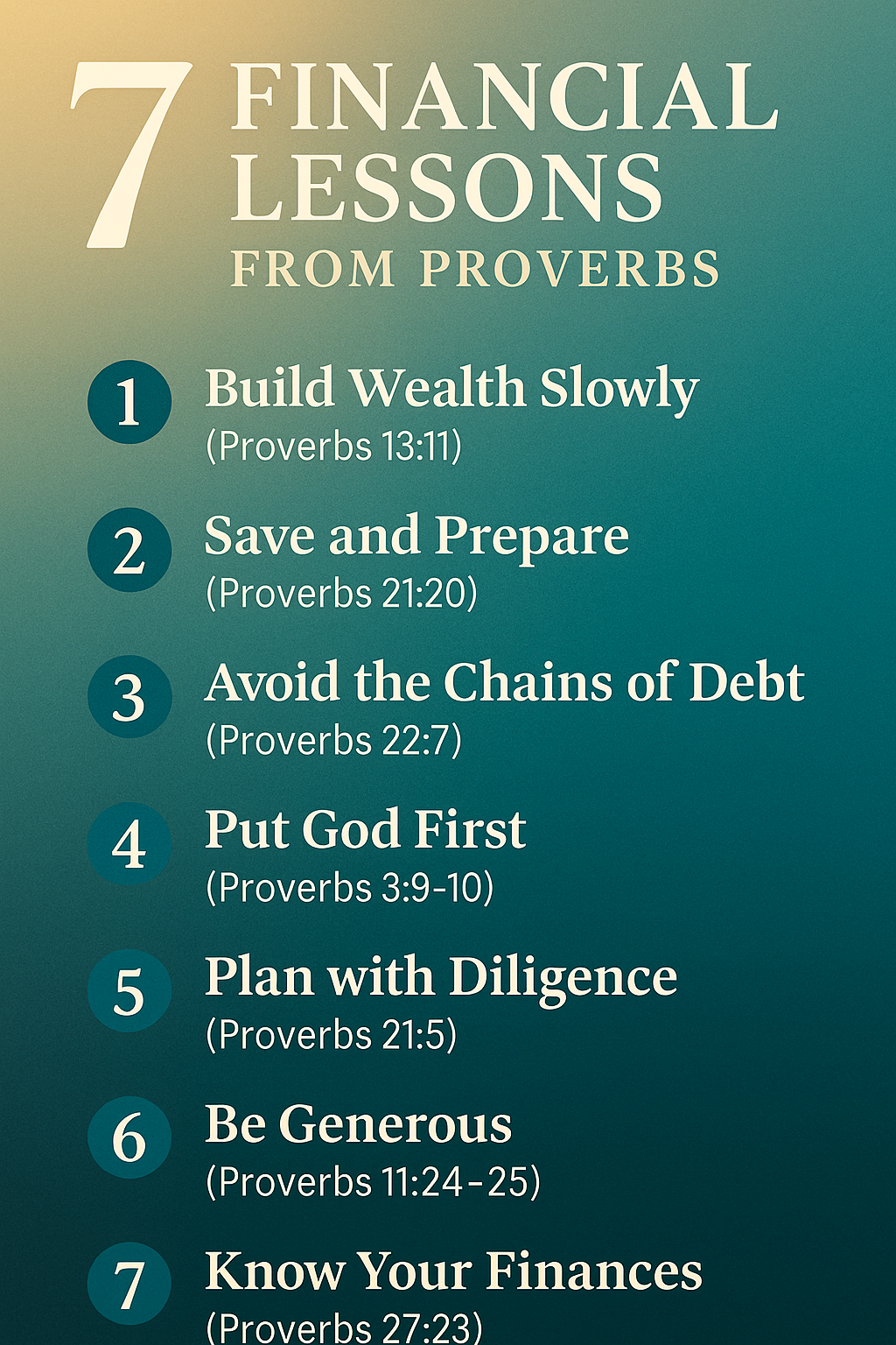 The wisdom of Proverbs is timeless. By applying these seven verses, you’ll not only strengthen your financial foundation but also grow closer to God, aligning your money with His will. Each proverb points to a bigger truth: money is not just about numbers, it’s about stewardship, discipline, and honoring the Lord.
